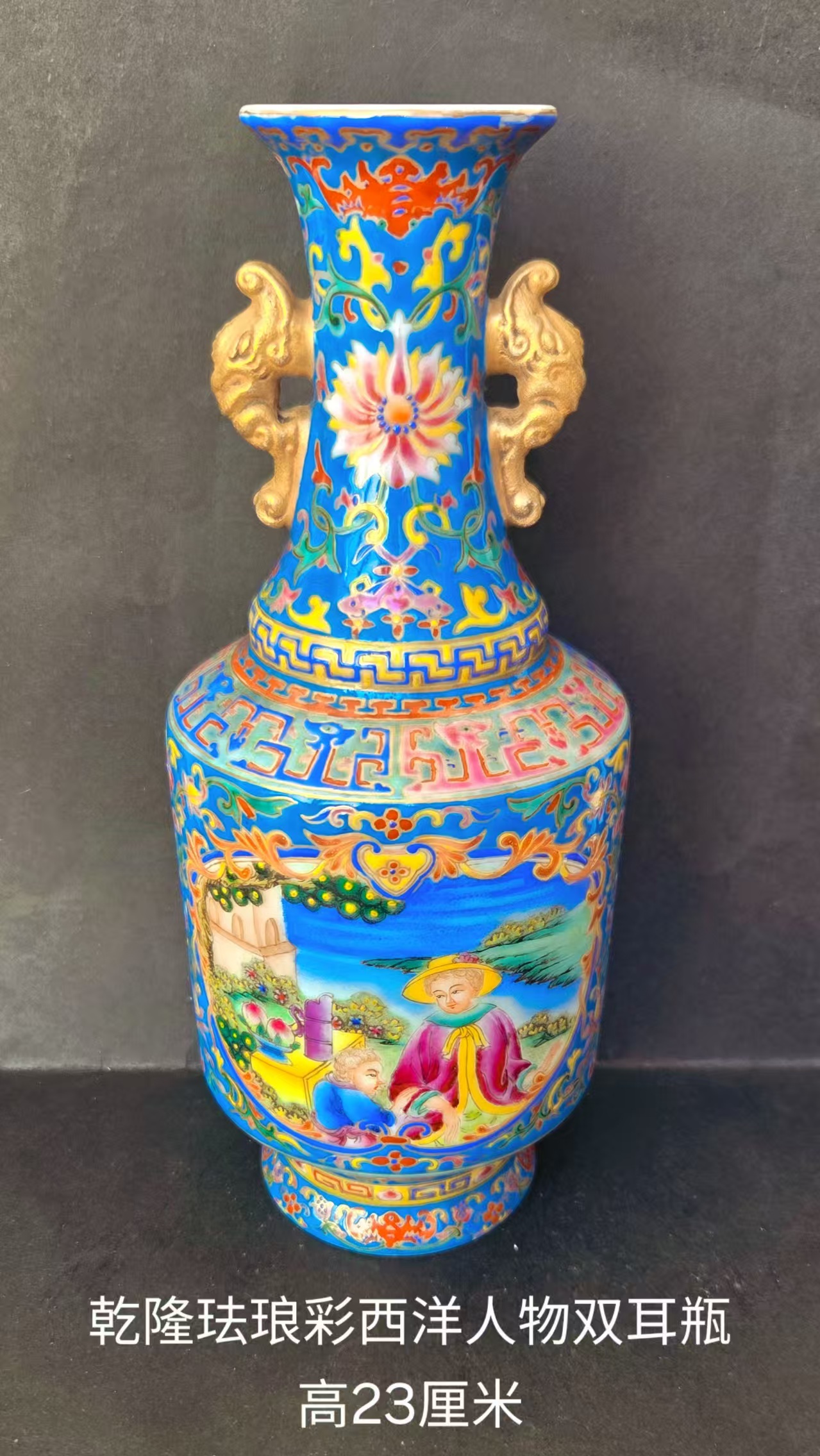 清乾隆珐琅彩西洋人物双耳瓶是乾隆时期 “洋彩” 工艺的典型代表。